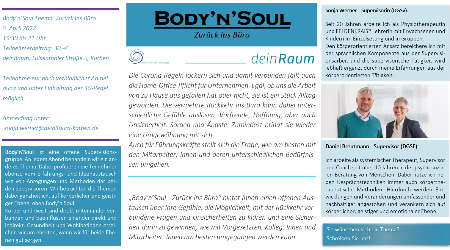 Body’n’Soul bietet euch einen Raum, über eure damit verbundenen Gedanken und Gefühle zu sprechen. Welche auch immer das sein mögen. Wir freuen uns auf eure Anmeldungen!